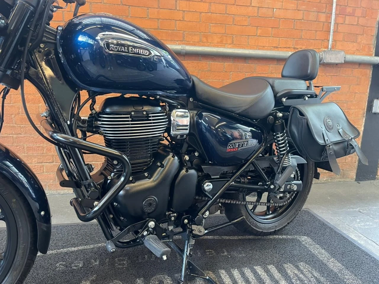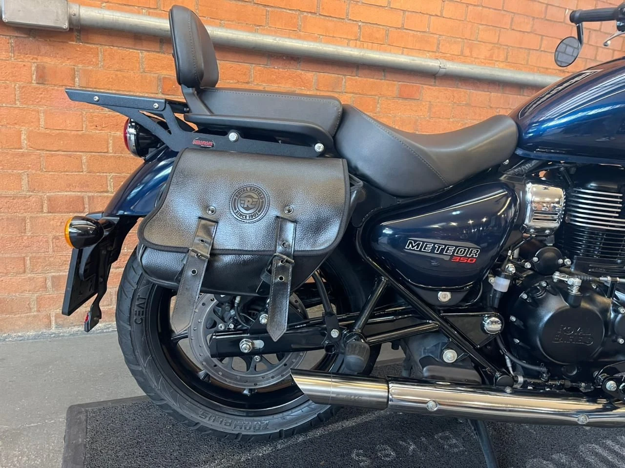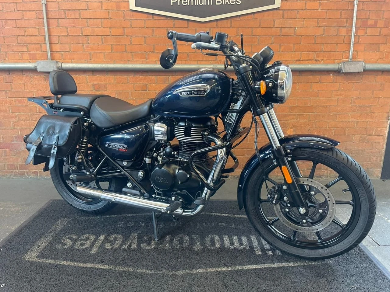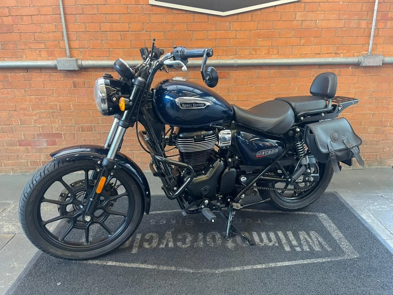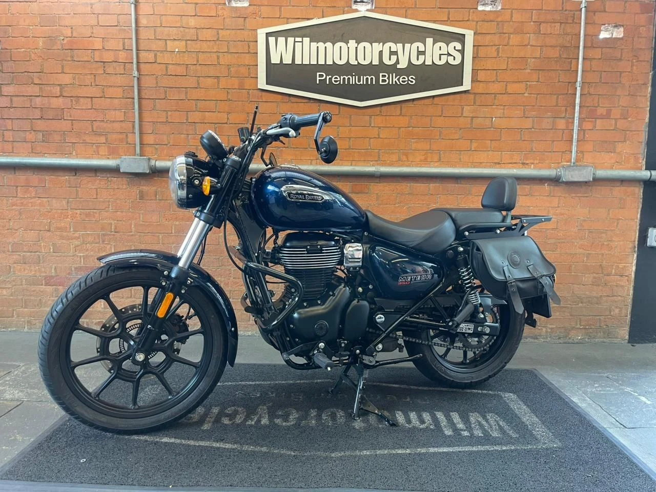 Royal Enfield Meteor; moto na cor azul; muito bem conservada; sistema de freios com assistência e discos; pastilhas novas; equipada com suporte para baú; suporte para malas; malas laterais instaladas; protetor de motor; encosto para o garupa; ponteiras esportivas que reforçam o visual e o som característico; ideal para quem busca conforto, estilo clássico e uma pilotagem tranquila tanto no dia a dia quanto em viagens; WILMOTORCYCLES, SUA MOTO ESTÁ AQUI.