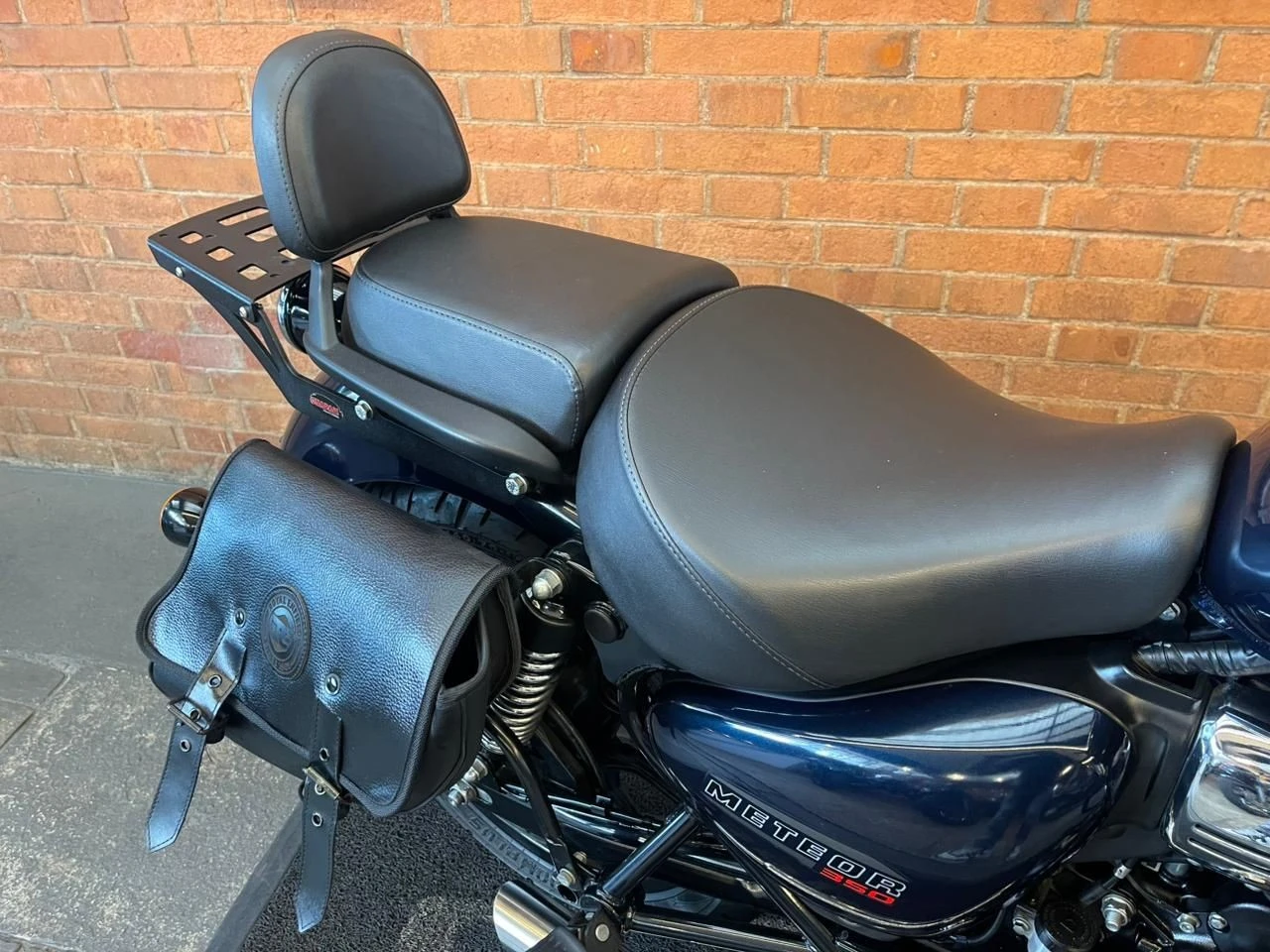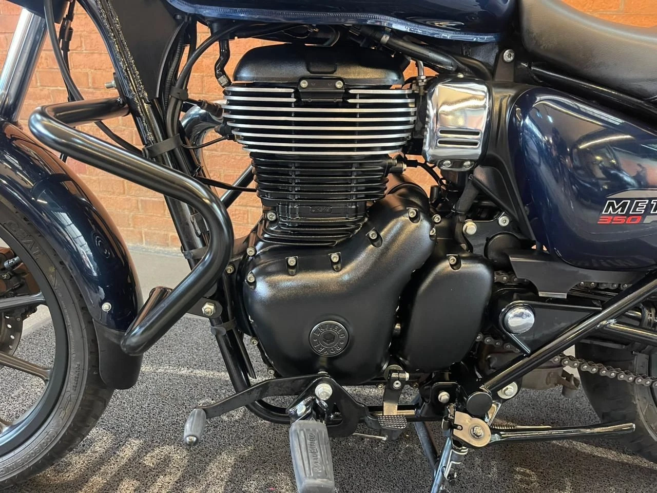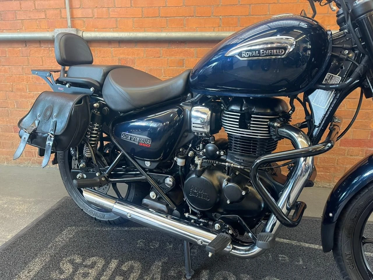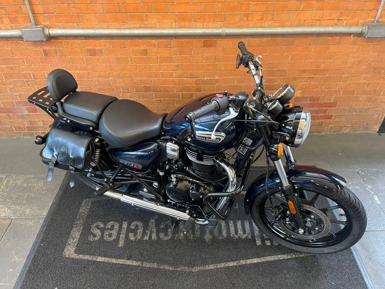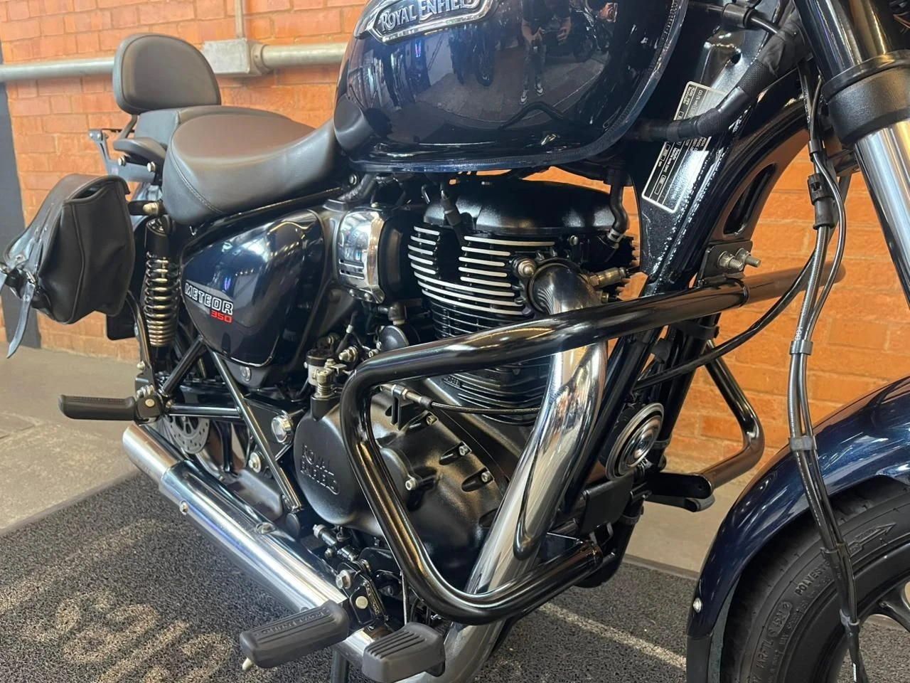 Royal Enfield Meteor; moto na cor azul; muito bem conservada; sistema de freios com assistência e discos; pastilhas novas; equipada com suporte para baú; suporte para malas; malas laterais instaladas; protetor de motor; encosto para o garupa; ponteiras esportivas que reforçam o visual e o som característico; ideal para quem busca conforto, estilo clássico e uma pilotagem tranquila tanto no dia a dia quanto em viagens; WILMOTORCYCLES, SUA MOTO ESTÁ AQUI.